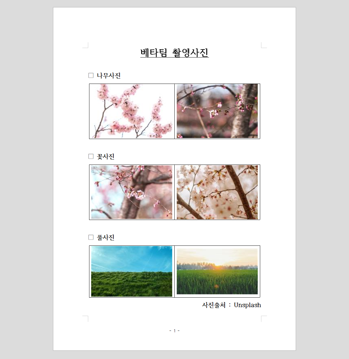문서에는 각각 "나무사진", "꽃사진", "풀사진" 이라는 제목 아래에