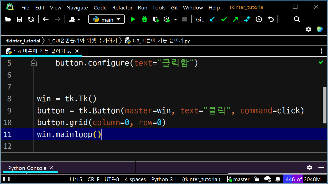 우선 button 인스턴스의 configure 메서드를 통해 text를 "클릭함"으로 변경하는 코드입니다.