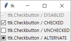 checkbutton3 = ttk.Checkbutton(win, text="ttk.Checkbutton / ALTERNATE", variable=check_value3)