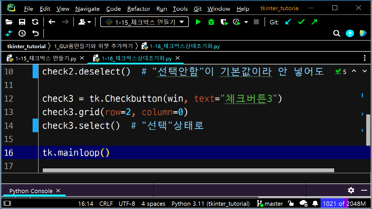 2022.11.16 - [기타/tkinter 한꼬집씩만 따라해보기] - 14. 체크박스 버튼 만들기