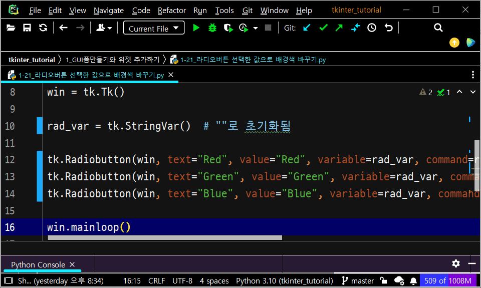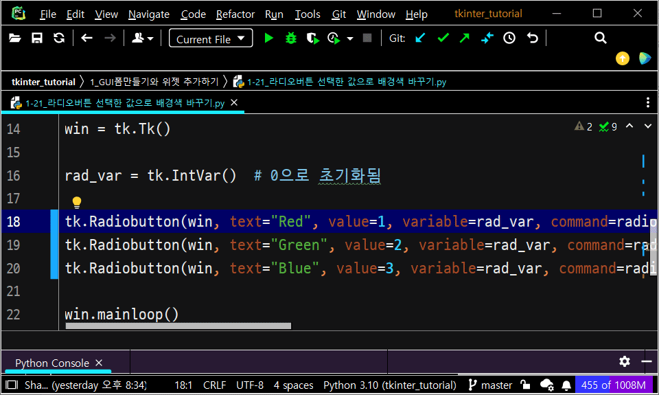 2022.11.17 - [기타/tkinter 한꼬집씩만 따라해보기] - 18. 라디오버튼 만들기