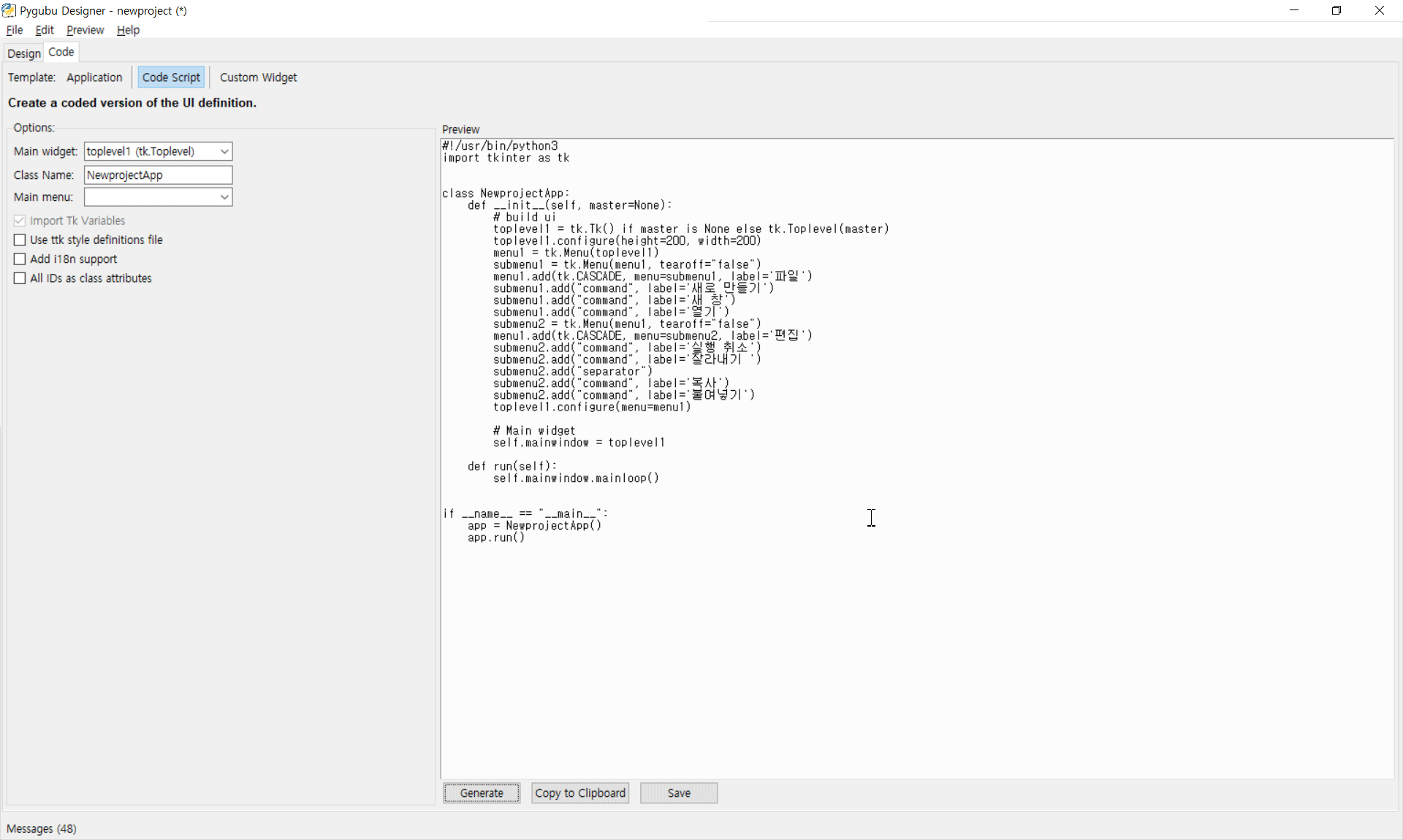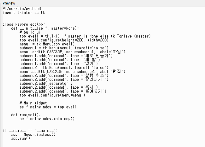 pygubu designer 같은 위지윅 툴을 사용하면 굉장히 간편히 메뉴바를 포함한 GUI를 생성할 수 있습니다.