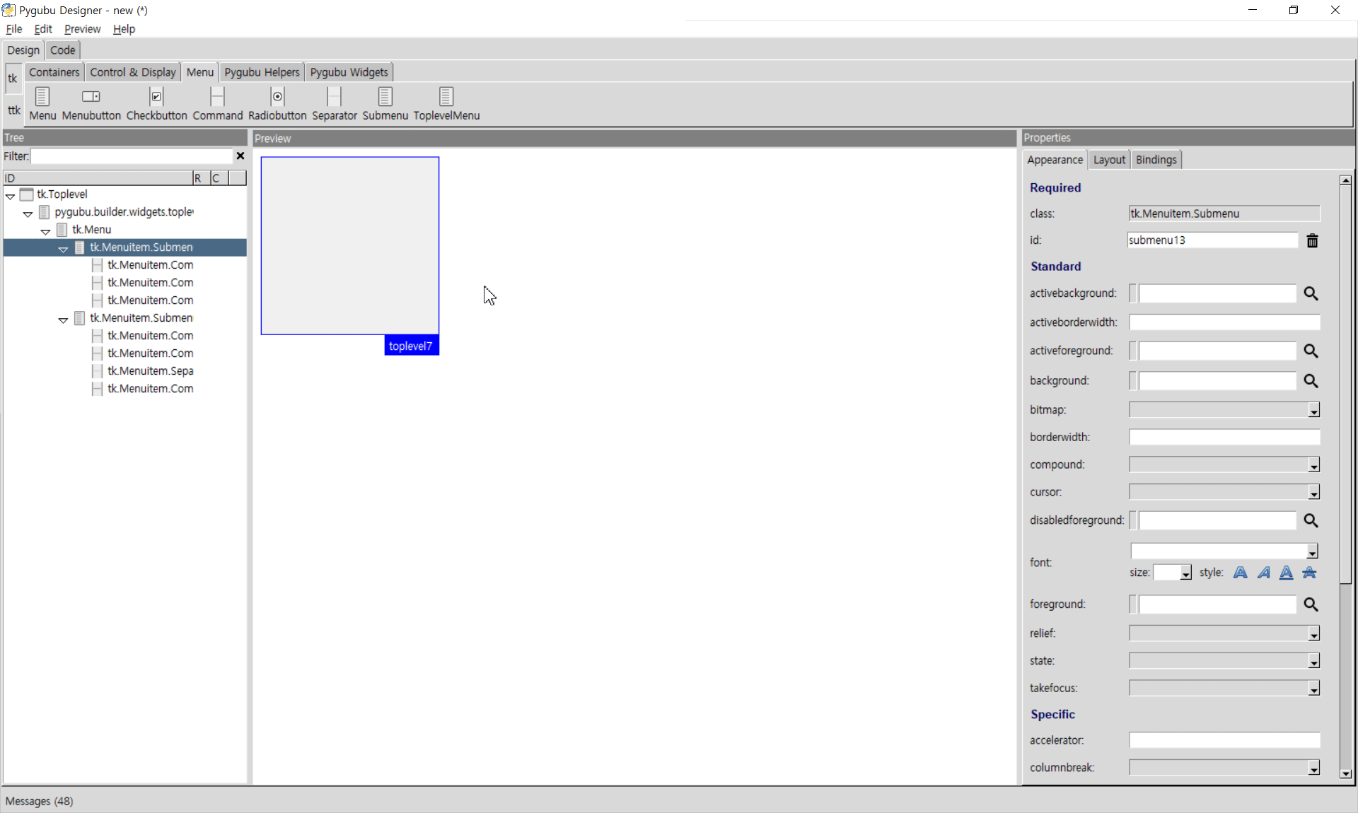 pygubu designer로 메뉴바를 만드는 과정 일부를 짧게 한 번 보여드리겠습니다.