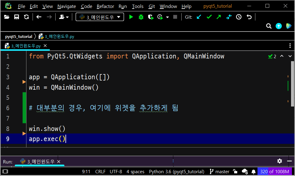 win = QMainWindow() # 메인윈도우 생성 (필수)