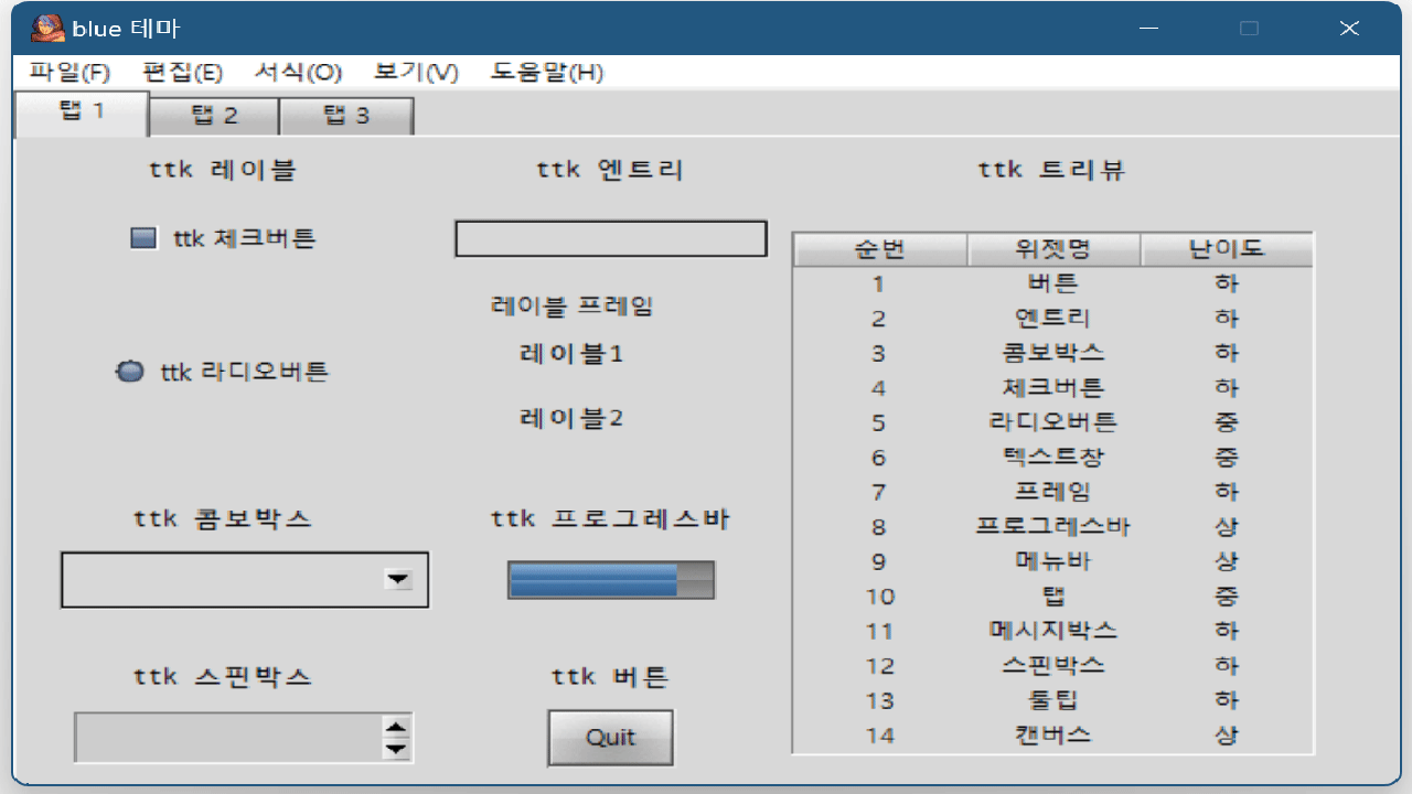 주의사항 : 첫 번째로 보여드린 ttkthemes와 ttkbootstrap을 같이 사용하는 경우 오류가 발생합니다.