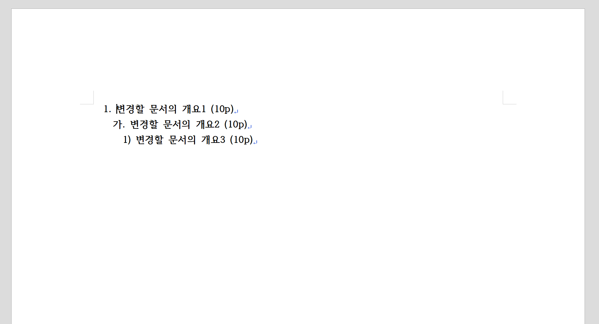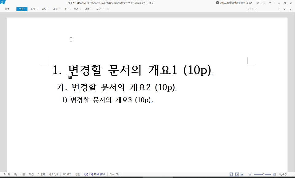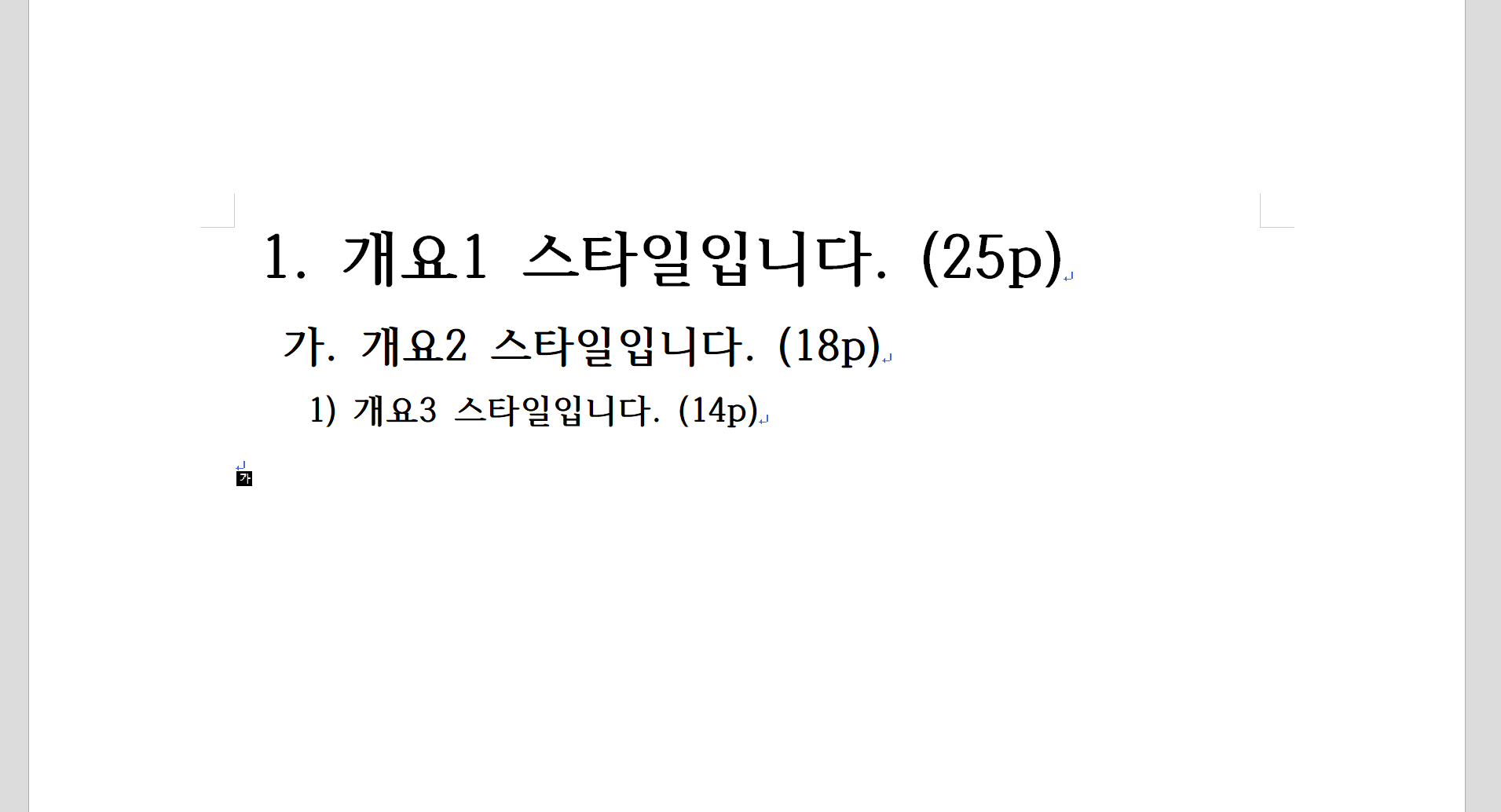 기본 스타일에서 서체 크기만 조정된 상태입니다. 개요1부터 3까지 각각 25, 18, 14p의 크기가 적용되어 있습니다.