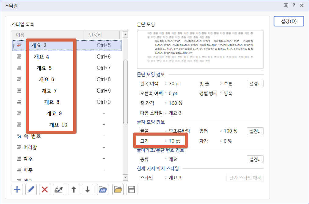 위와 같이 모든 스타일개요의 글자크기가 10pt인데,