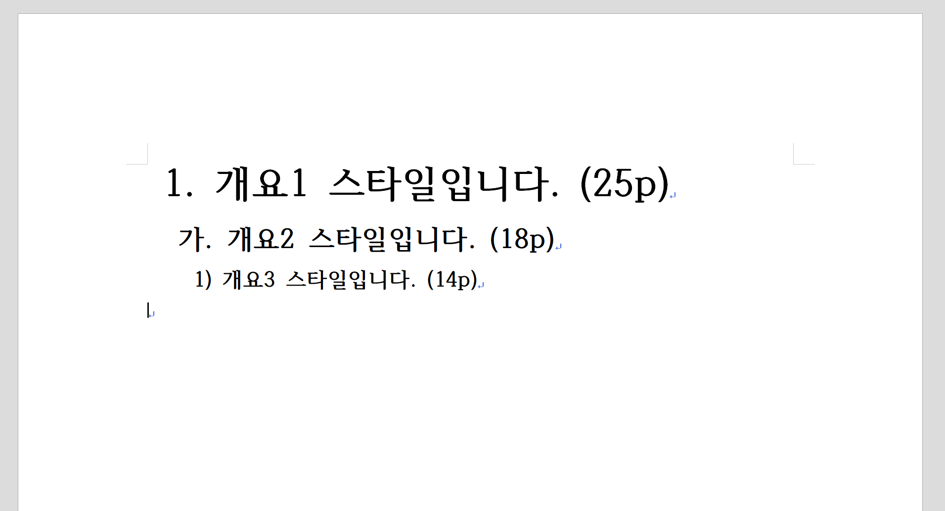 개요1, 2, 3의 글자크기가 각각 25pt, 18pt, 14pt 입니다.
