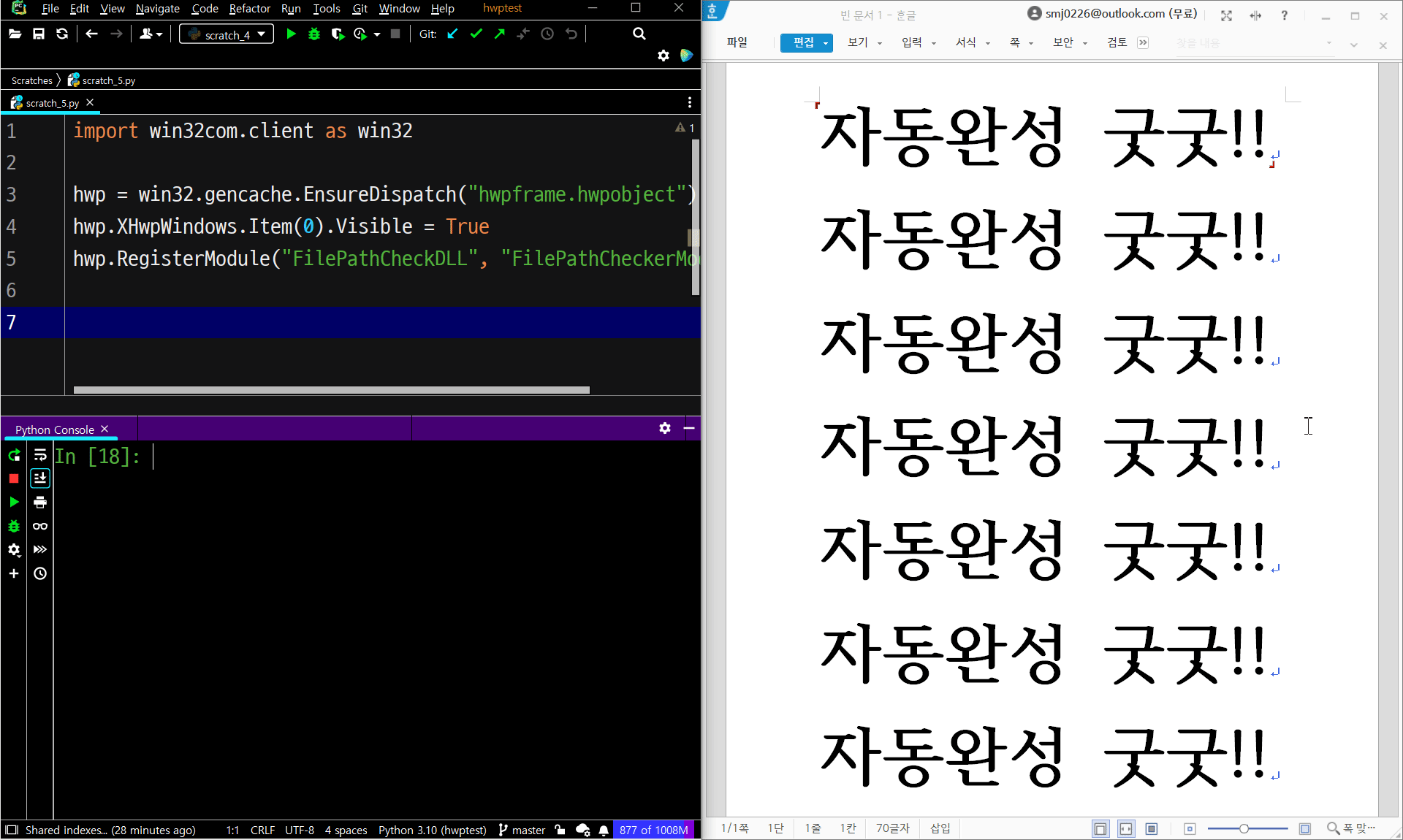 한/글 API 코드를 파이참 에디터창이 아닌, 콘솔창에서 입력해보면 자동완성이 대부분 작동합니다.
