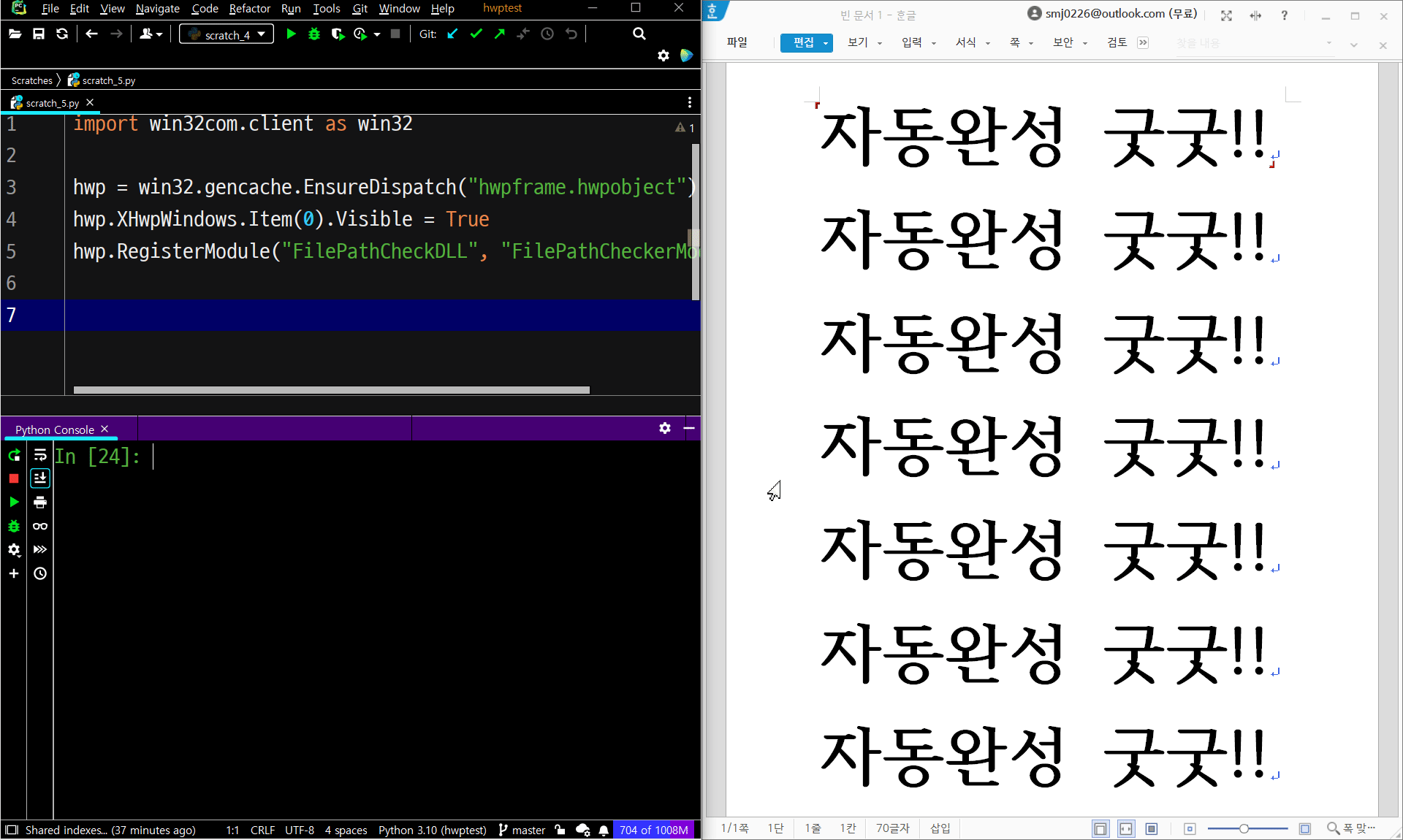 한/글 API 코드를 파이참 에디터창이 아닌, 콘솔창에서 입력해보면 자동완성이 대부분 작동합니다.