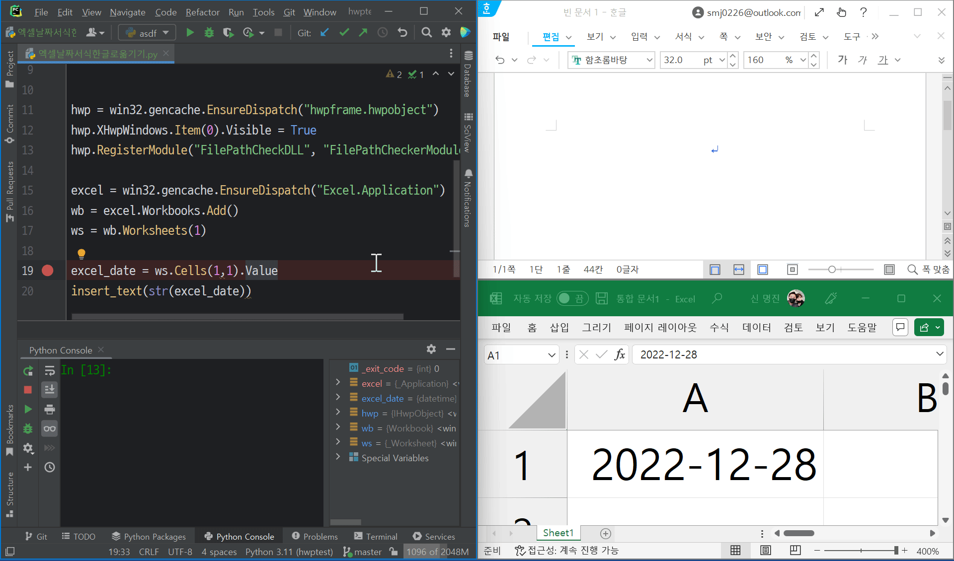 우선 아래와 같이 파이썬으로 엑셀과 한글을 같이 열어주고
