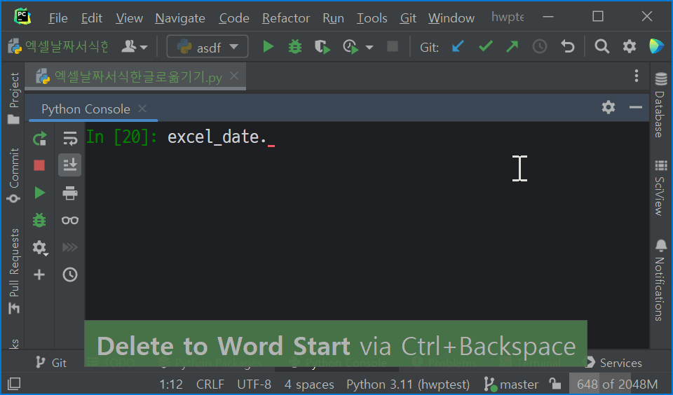 이제 아래와 같이 엑셀의 날짜 값을 한/글에 삽입하면(insert_text 함수를 정의해 두었음)