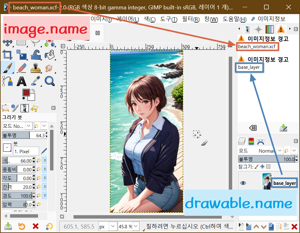 파일명(image.name)과 활성레이어 이름(drawable.name)이 정상적으로 출력되는 것을 확인하였습니다.