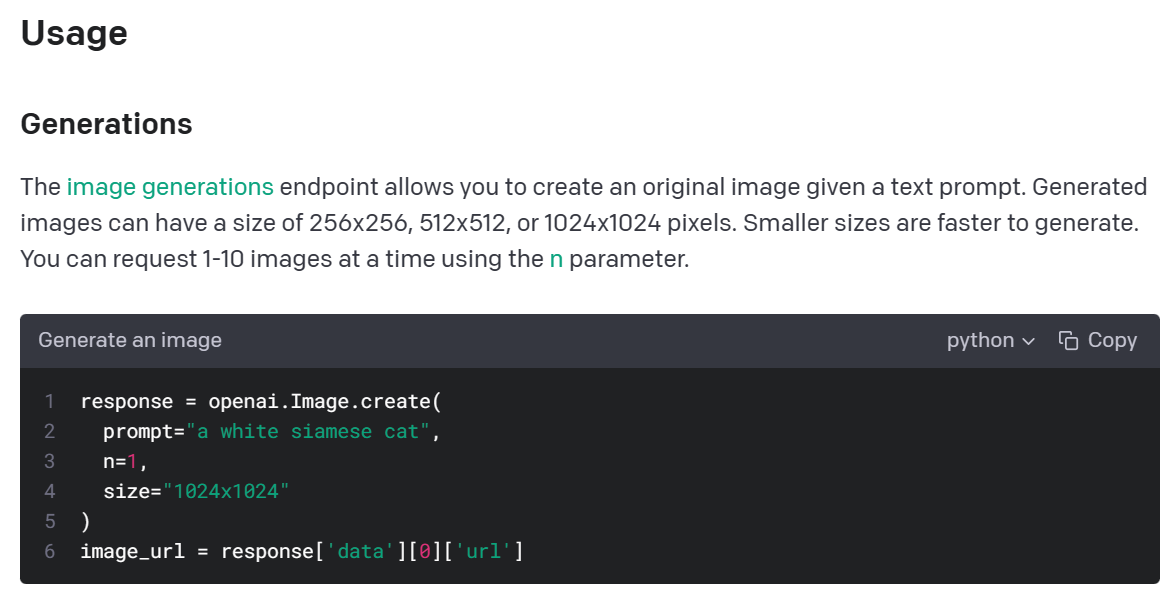화면을 조금만 내려보면 이미지 생성을 위한 openai 모듈의 사용법이 나와 있습니다.