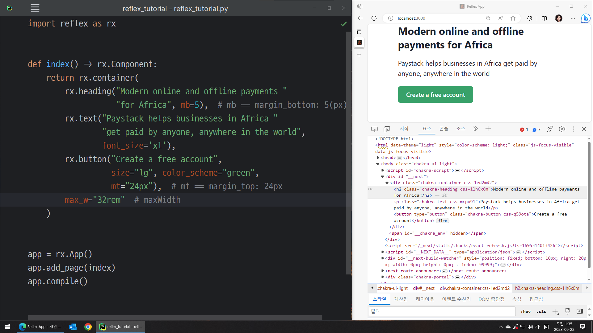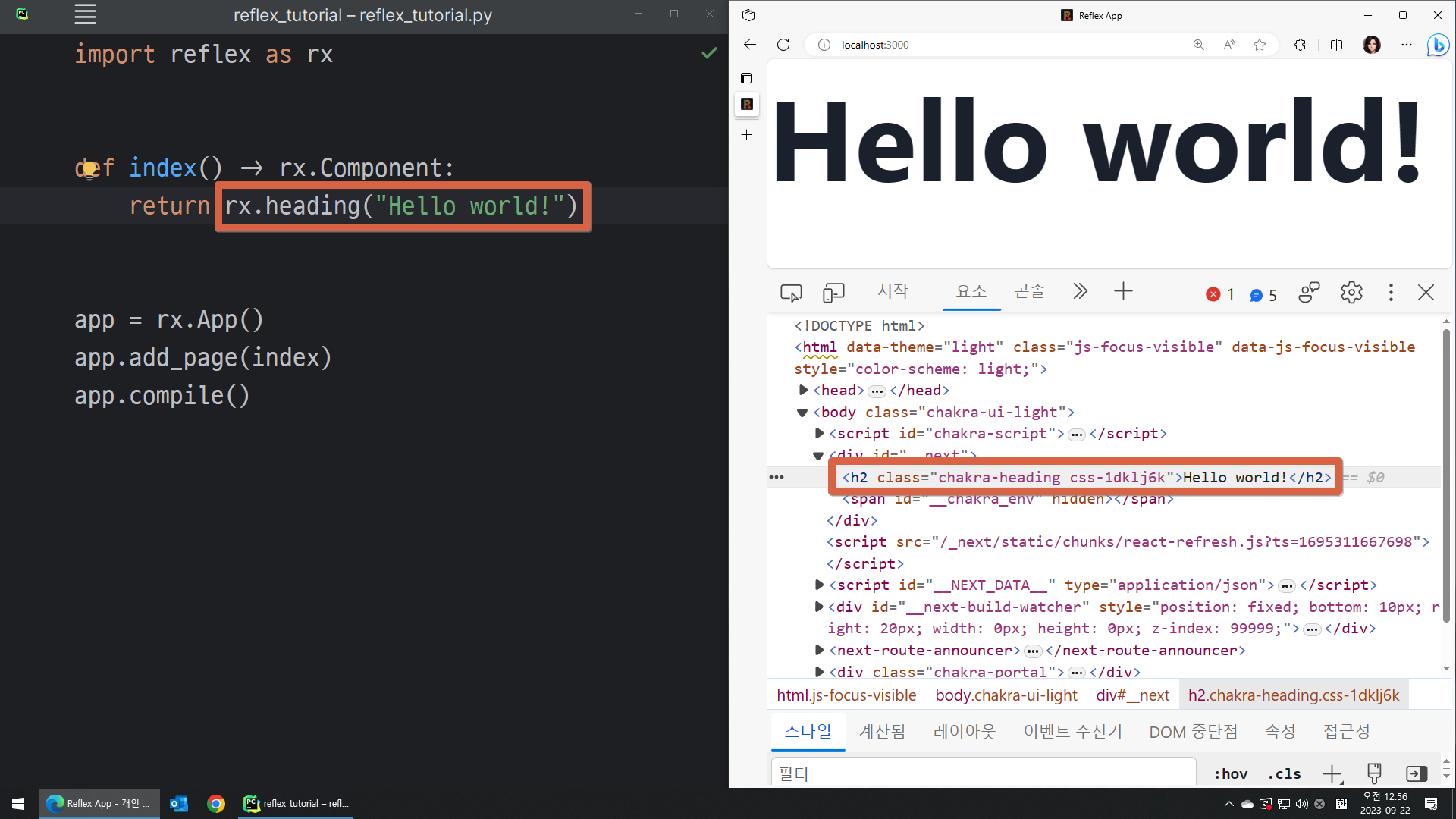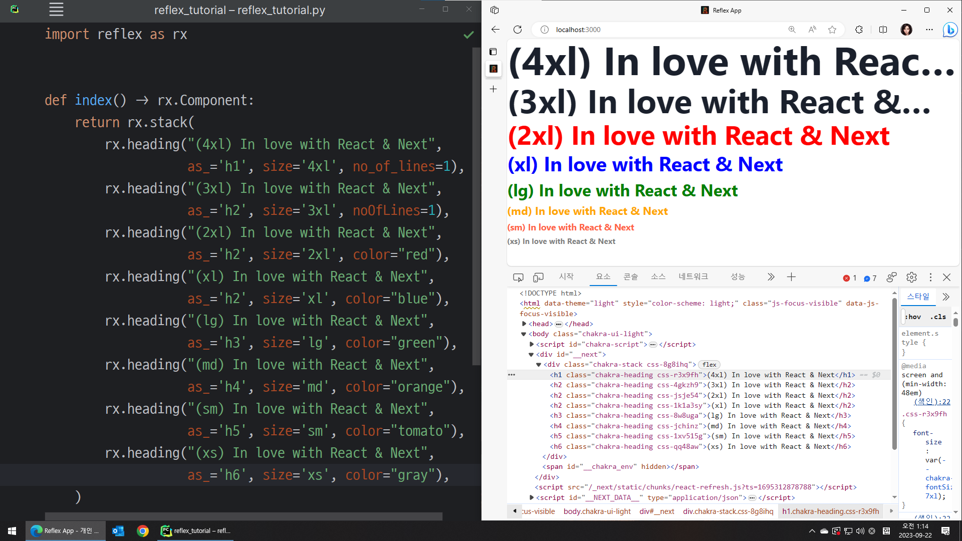 rx.heading 컴포넌트는 파이썬의 문자열을 "제목(heading)"으로 표시해줍니다.
