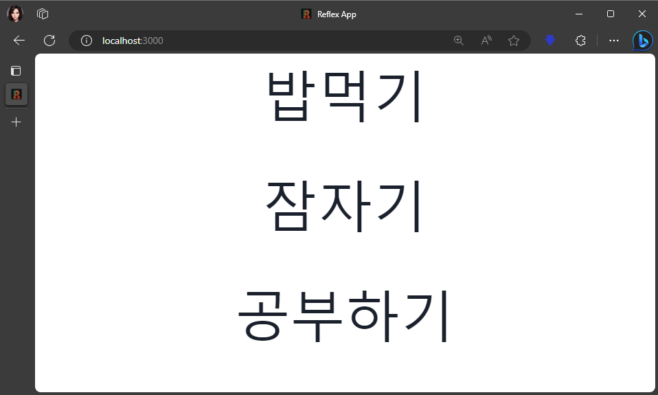 실행화면은 아래와 같다. (rx.vstack은 가운데정렬이 기본값이다.)