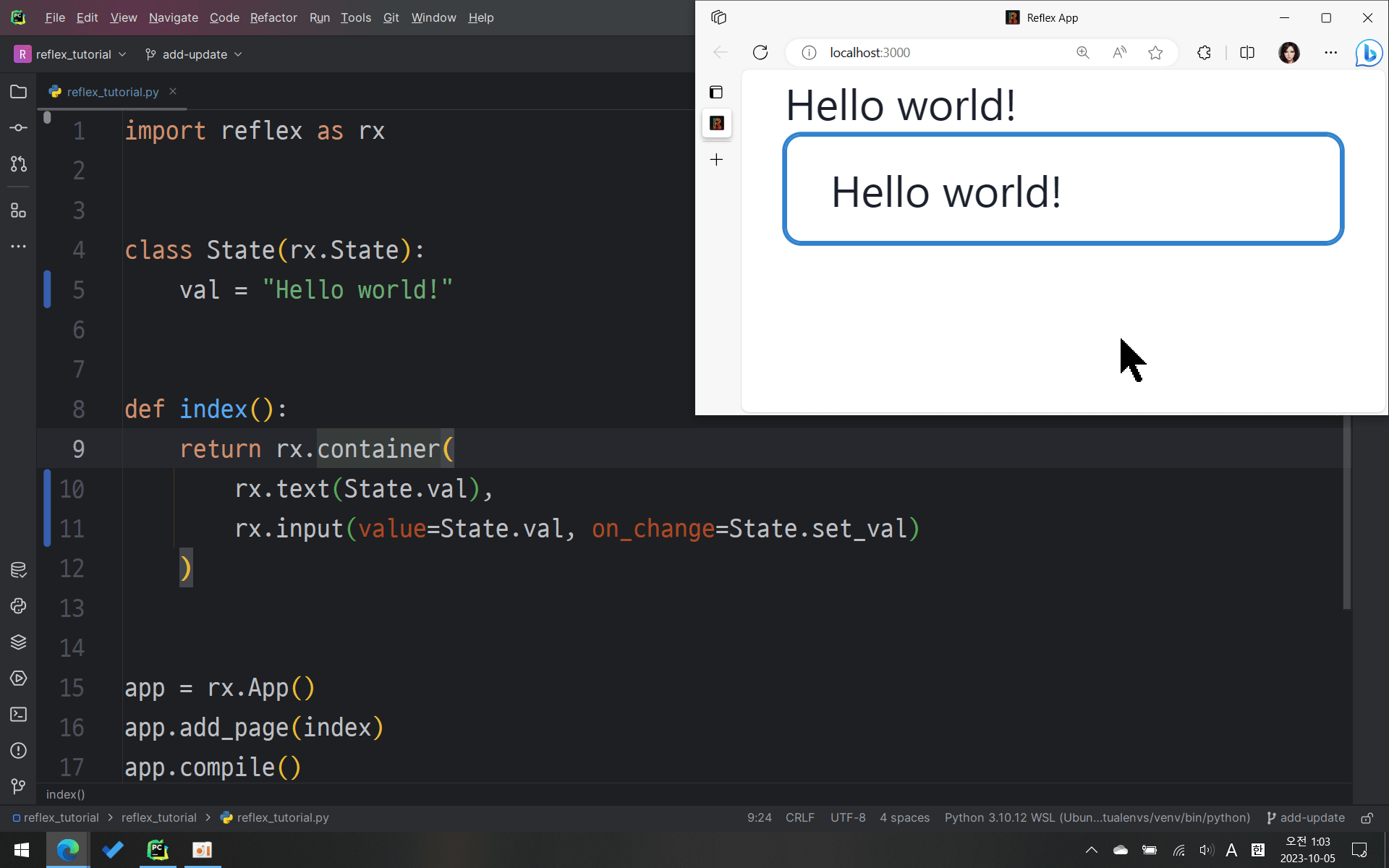 on_change 이벤트에 (자동생성되는) State.set_val이라는 이벤트핸들러를 연결하면