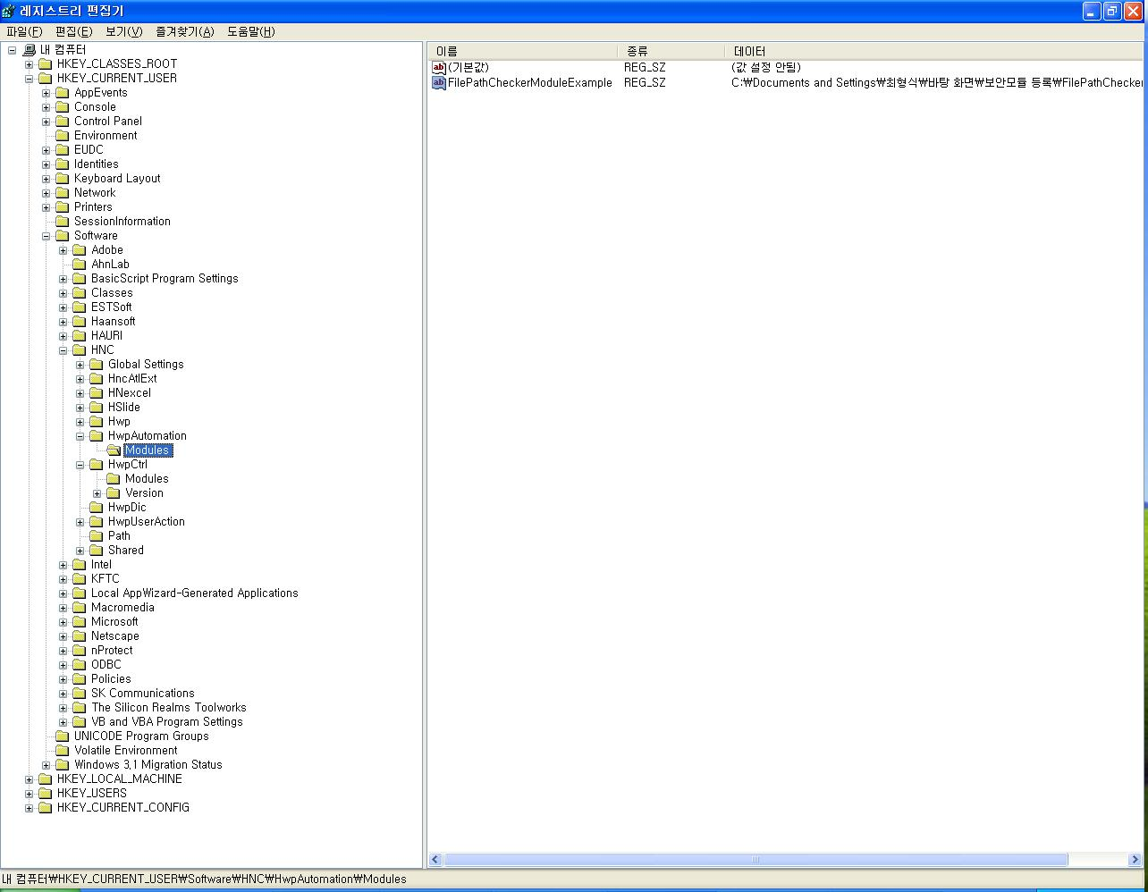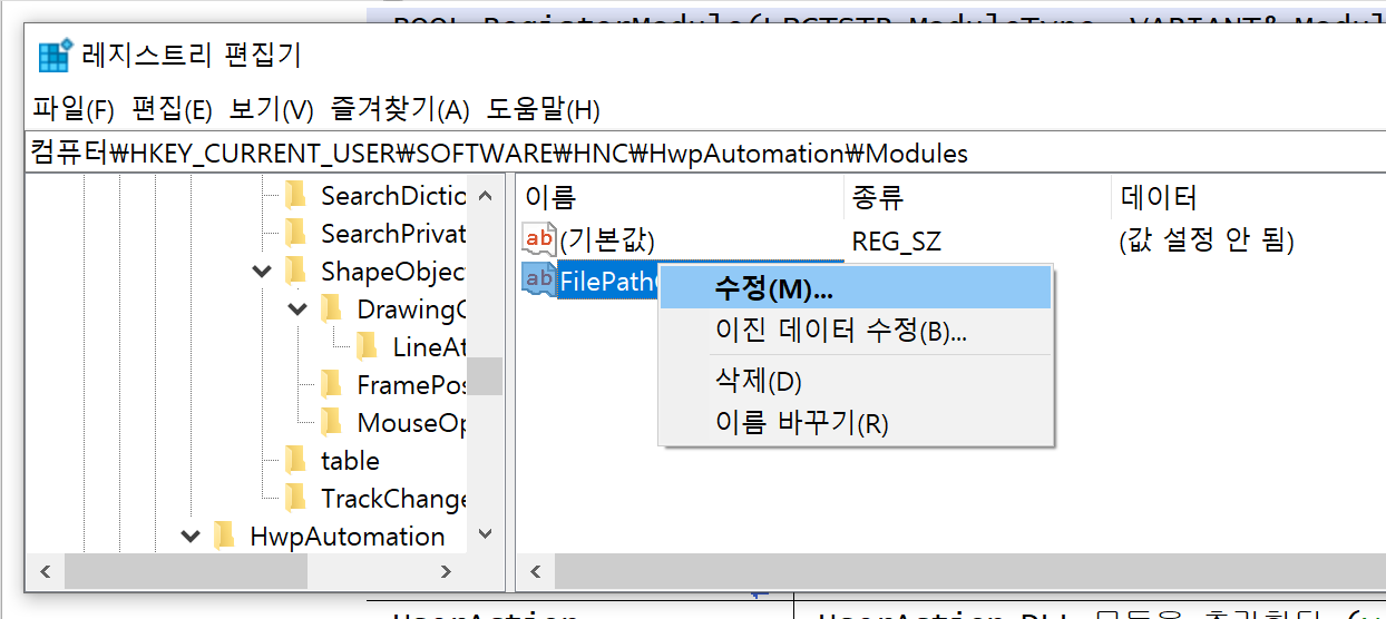 다. 아래 주소(HKEY_CURRENT_USER\SOFTWARE\HNC\HwpAutomation\Modules)로 이동합니다.
