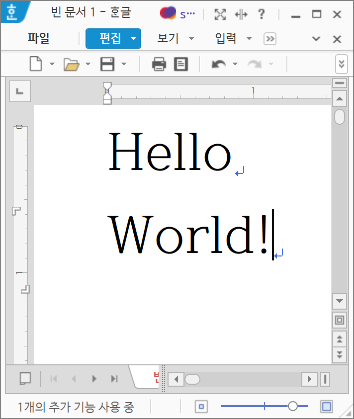 파이썬 콘솔에서 실행했던 >>>print("Hello World!")를 한/글에서도 실행해보겠습니다.