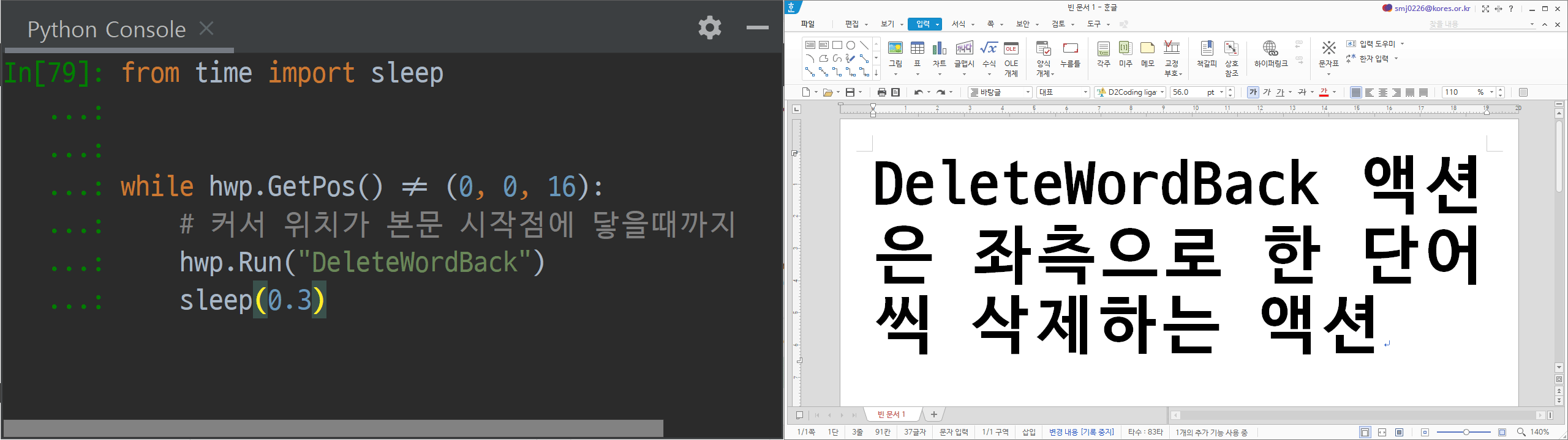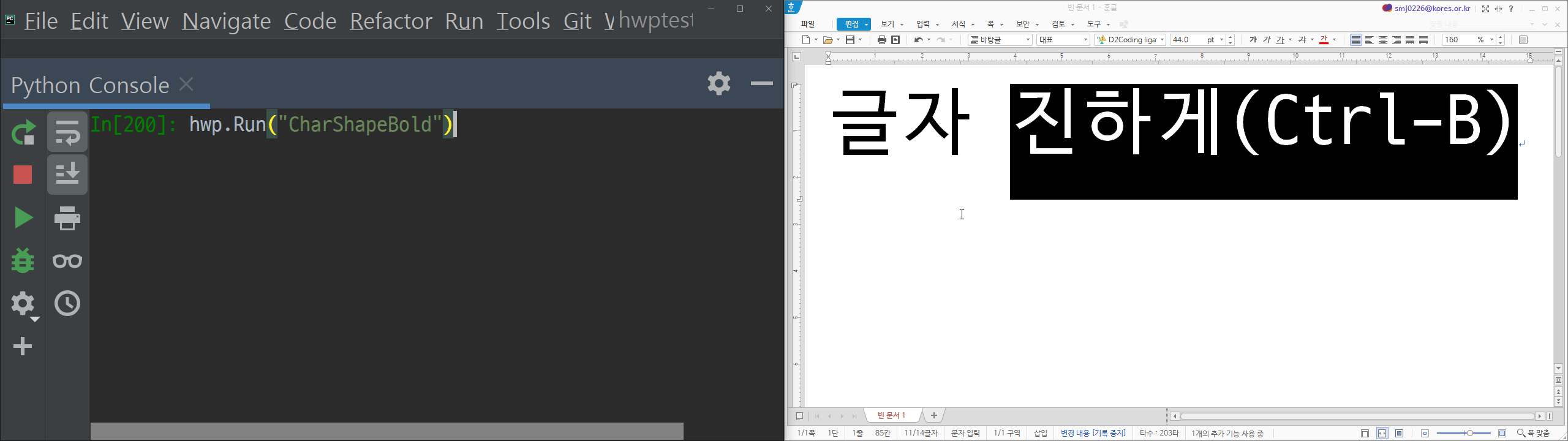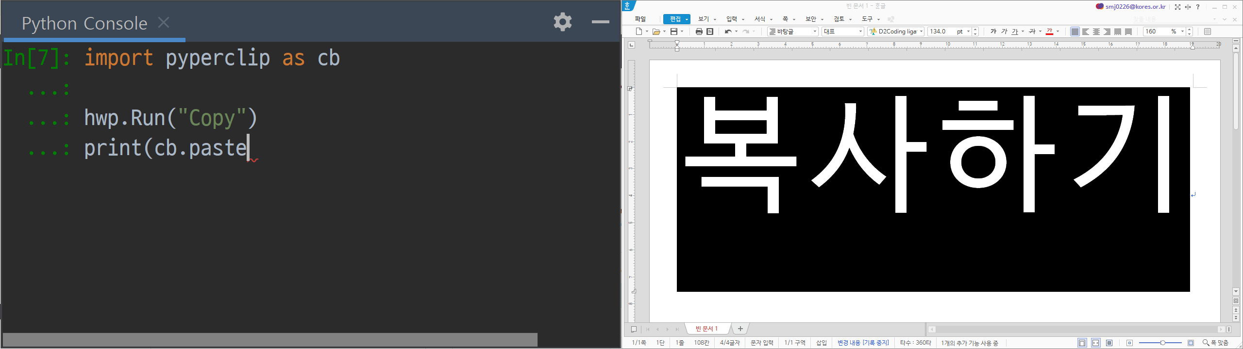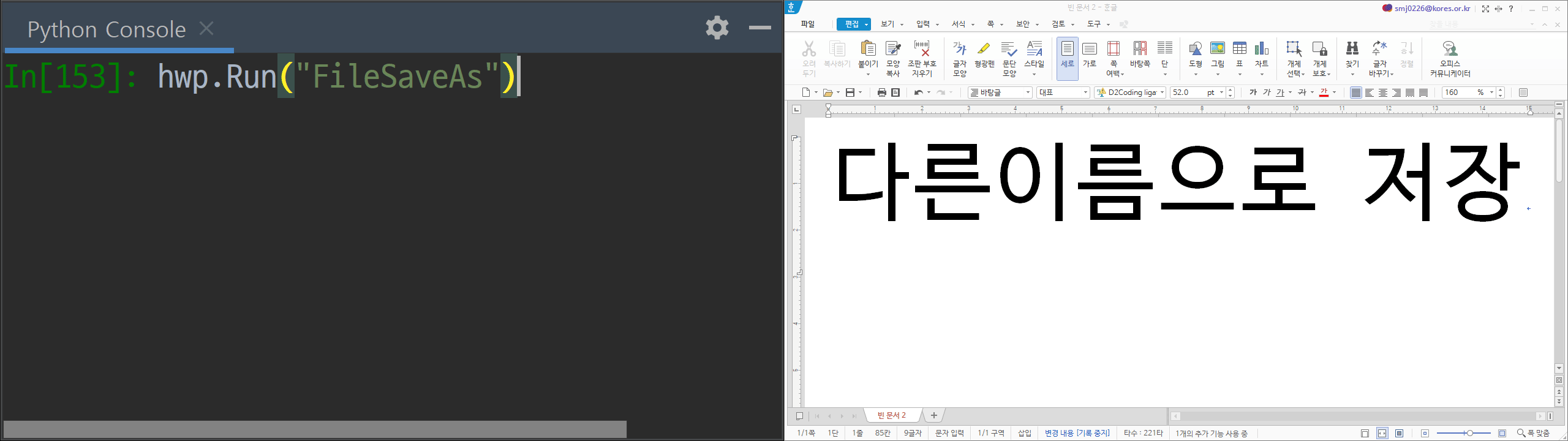 아래 예제는 hwp.Run("액션") 방식으로 모든 설명이 진행됩니다.