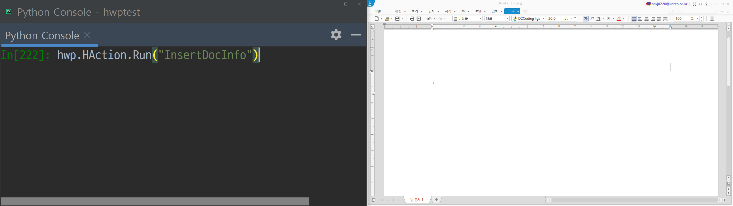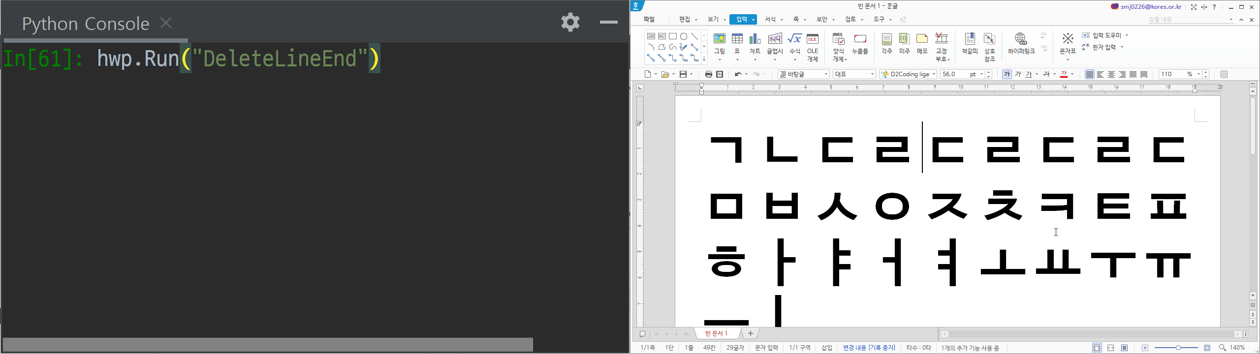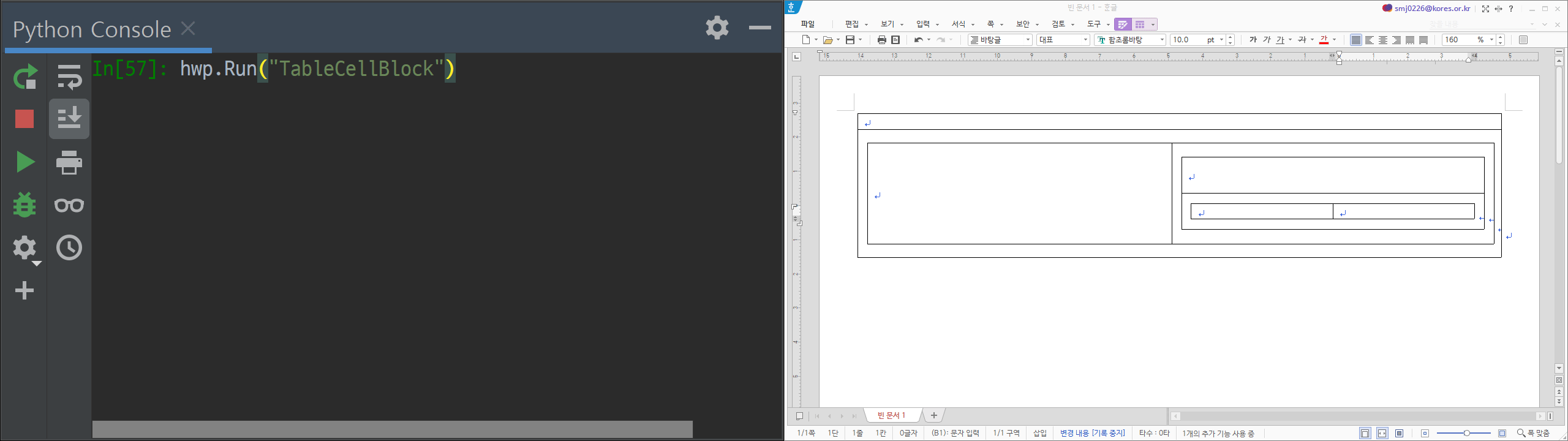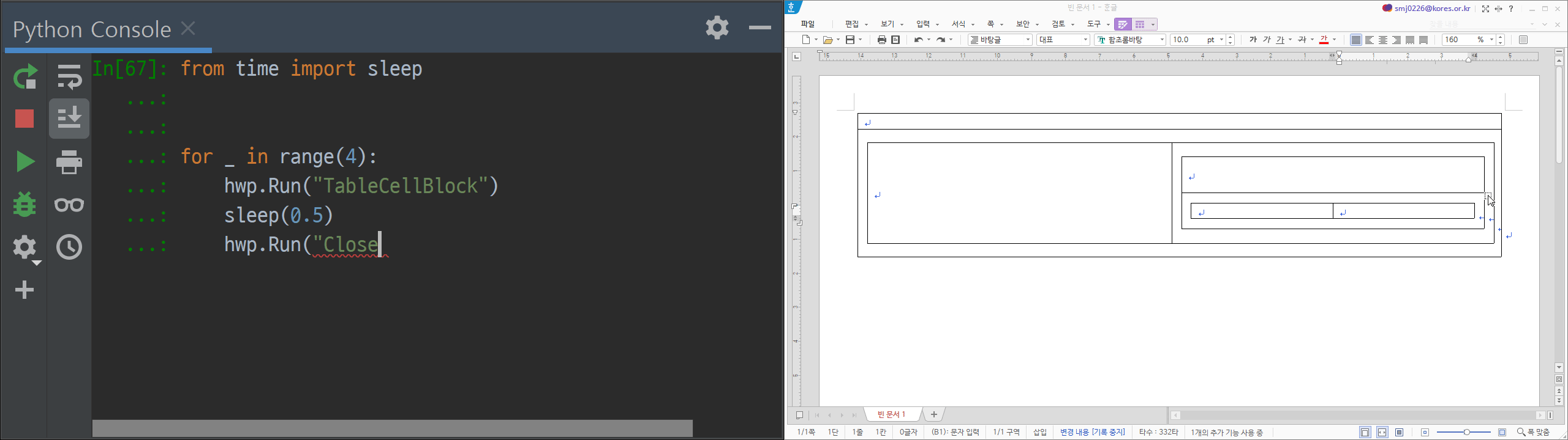 아래 예제는 hwp.Run("액션") 방식으로 모든 설명이 진행됩니다.