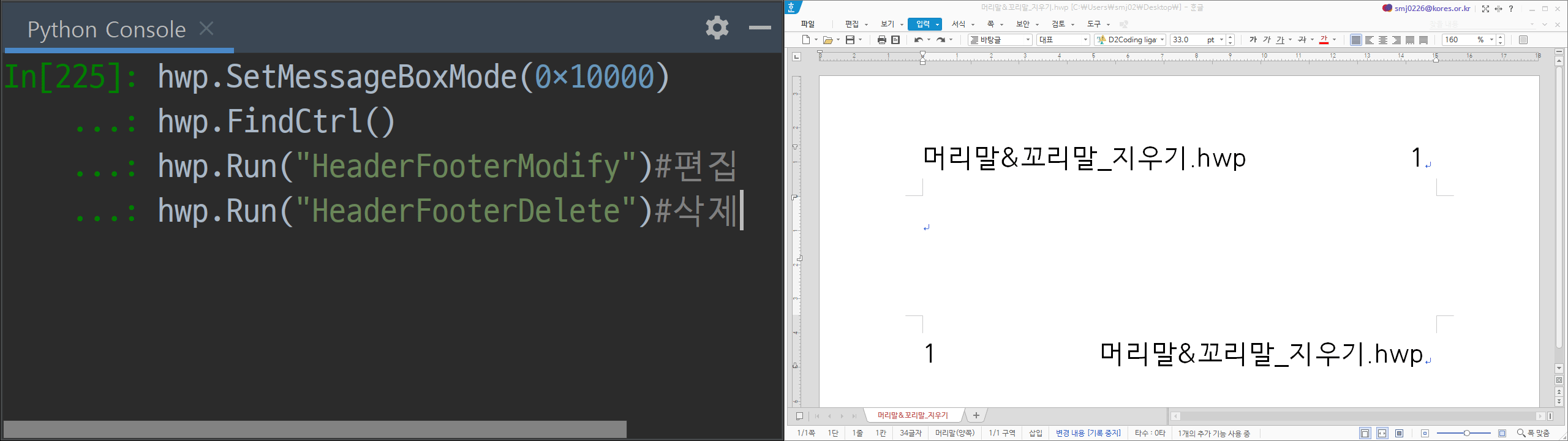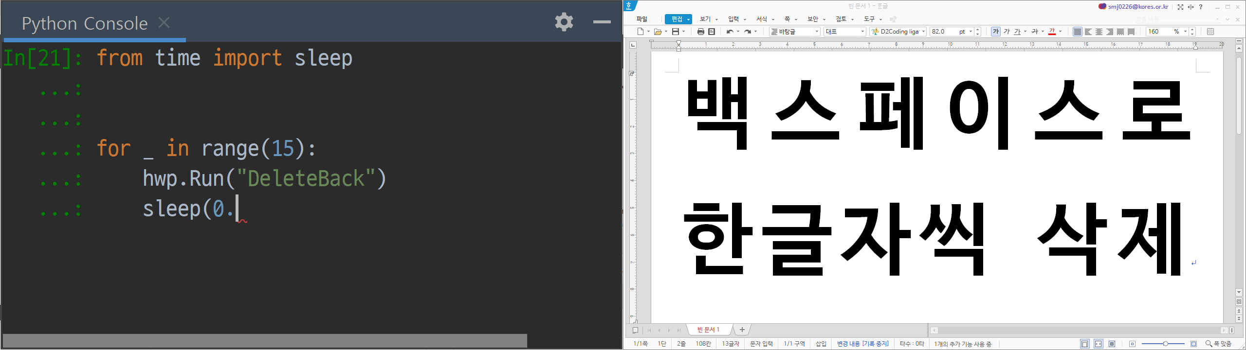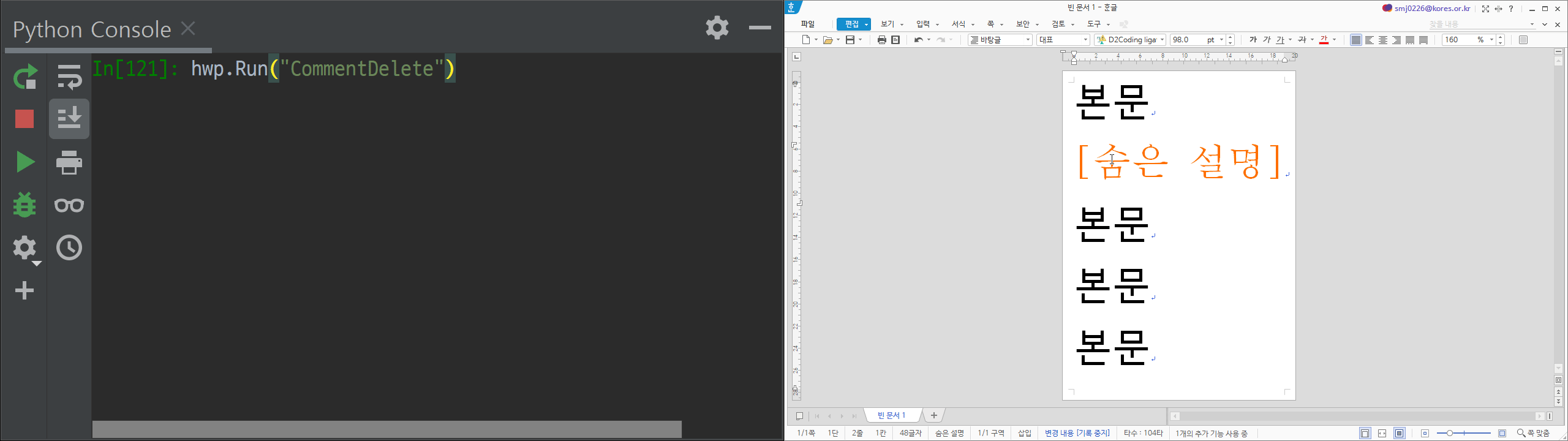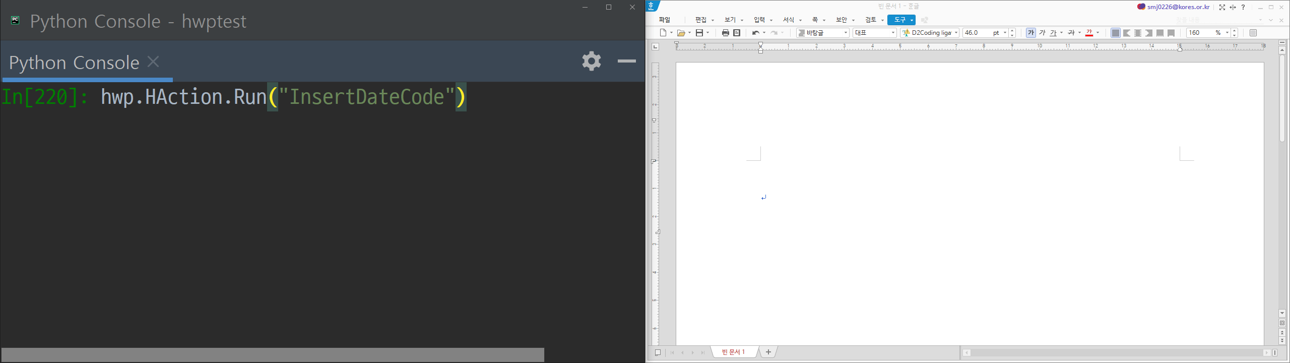 아래 예제는 hwp.Run("액션") 방식으로 모든 설명이 진행됩니다.