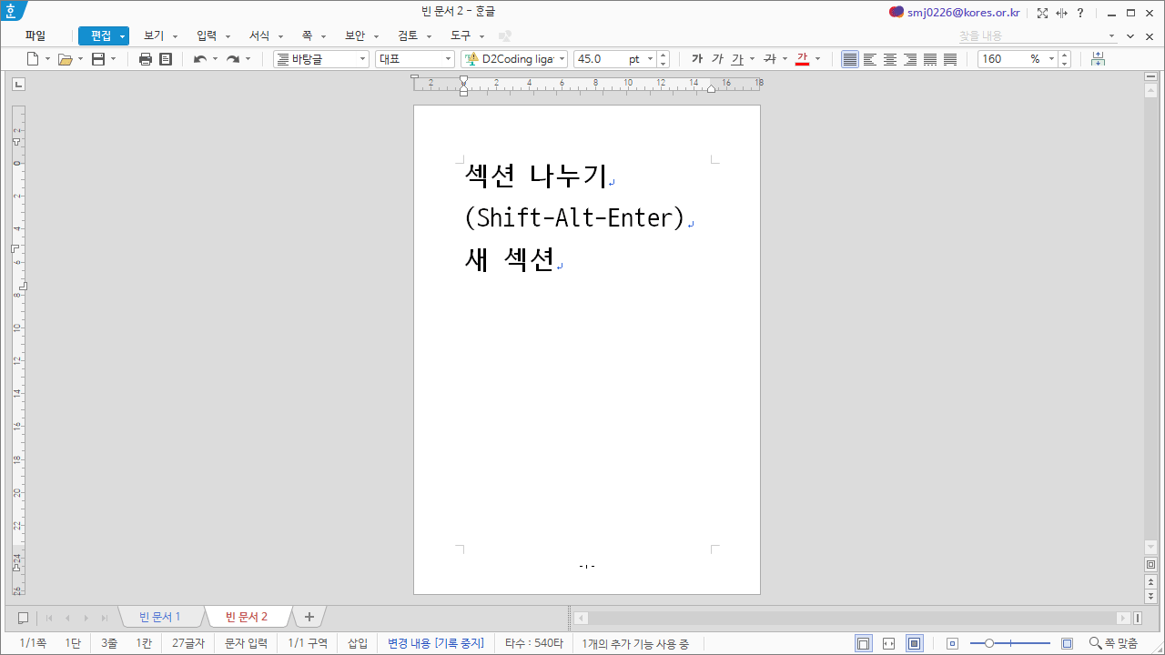 구역[섹션] 나누기 액션(Shift-Alt-Enter). 새로 생성된 섹션에서는 편집용지를 다르게 설정하거나, 혹은 새 개요번호/모양을 만든다든지 할 수 있다. 단, 초깃값으로 새 섹션이 생성되는 게 아니라, 기존 섹션의 편집용지, 바탕쪽 상태, 각주/미주 모양, 프레젠테이션 상태, 쪽 테두리/배경 속성 및 단 모양 등 대부분을 그대로 이어받으며, 새 섹션에서 수정시 기존 섹션에는 대부분 영향을 미치지 않는다.
