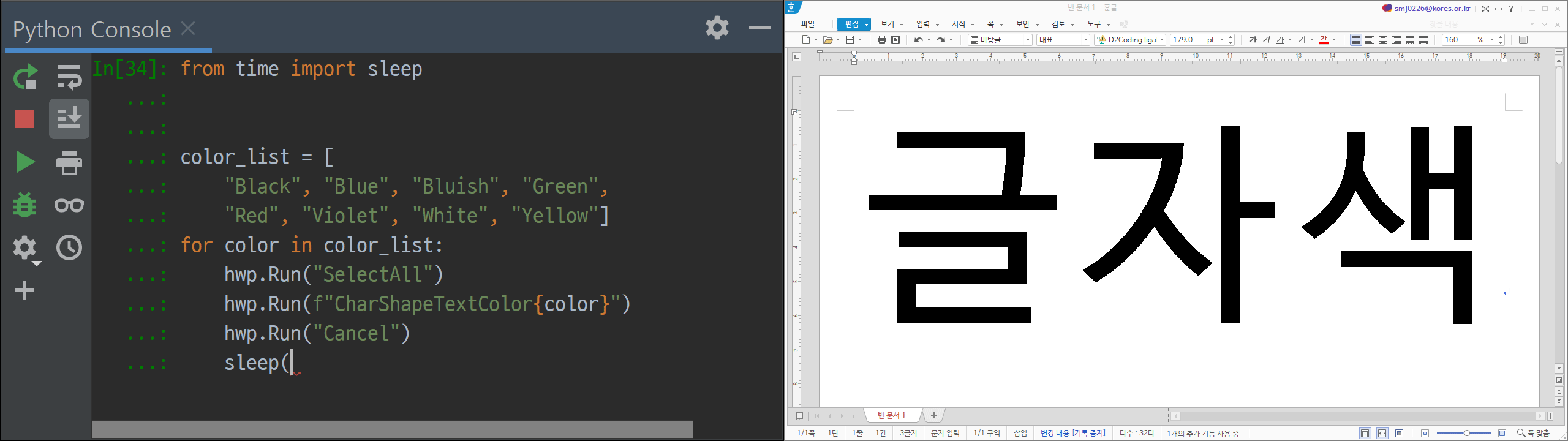 hwp.Run("CharShapeTextColor[글자색]") ★★☆