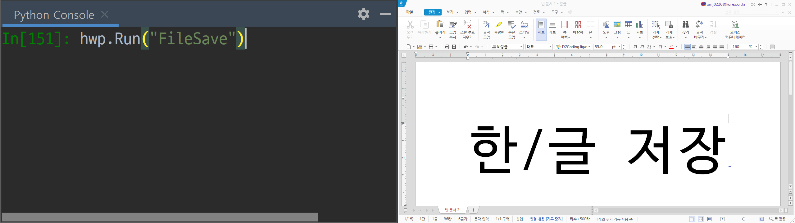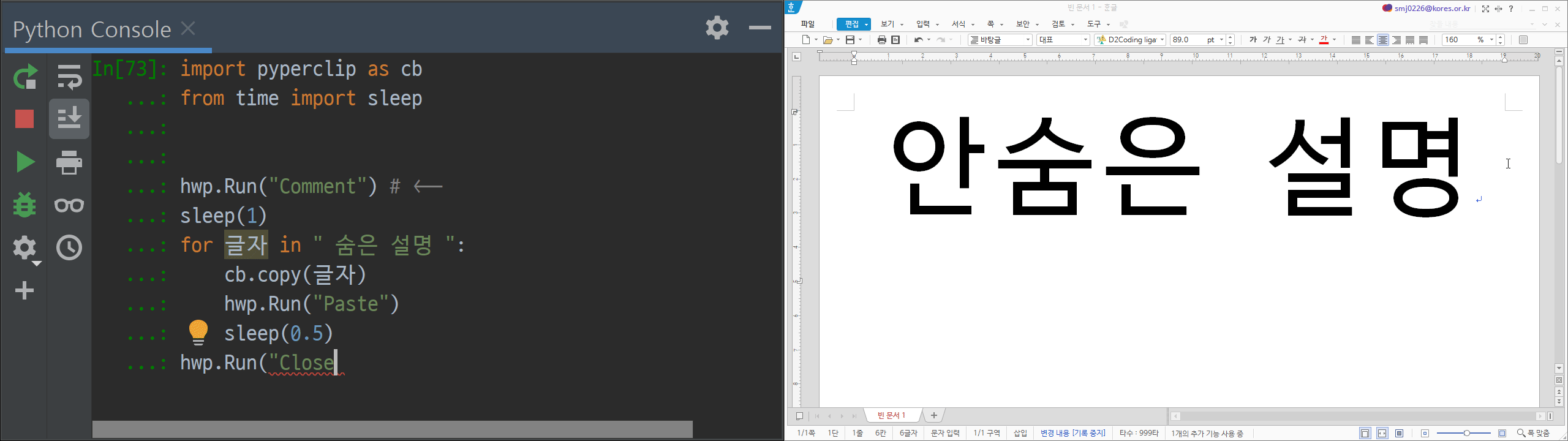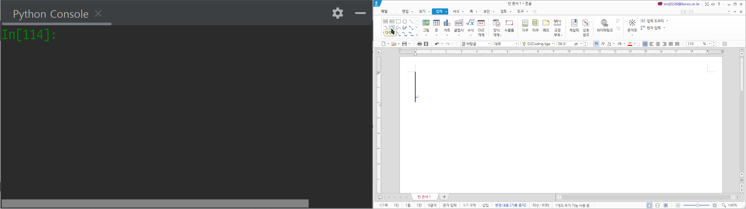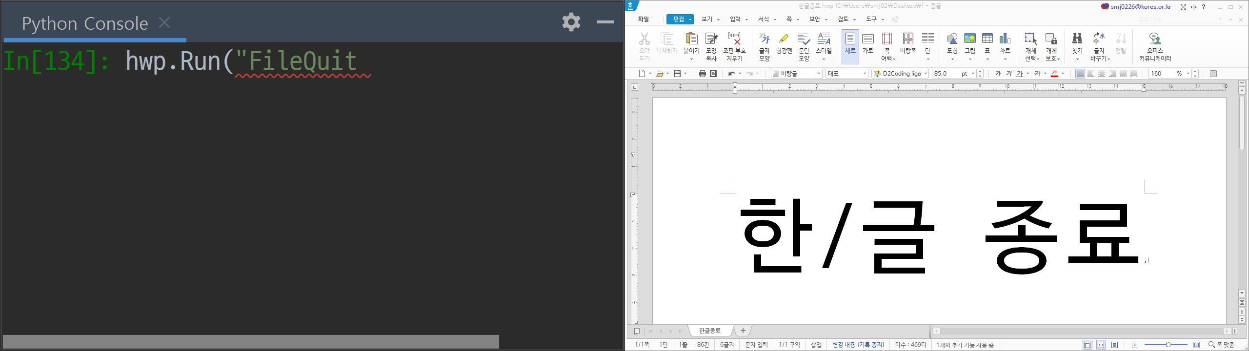 파이썬으로 한/글을 여는 방법은, 파이썬을 열고 아래 코드를 실행하시면 됩니다.