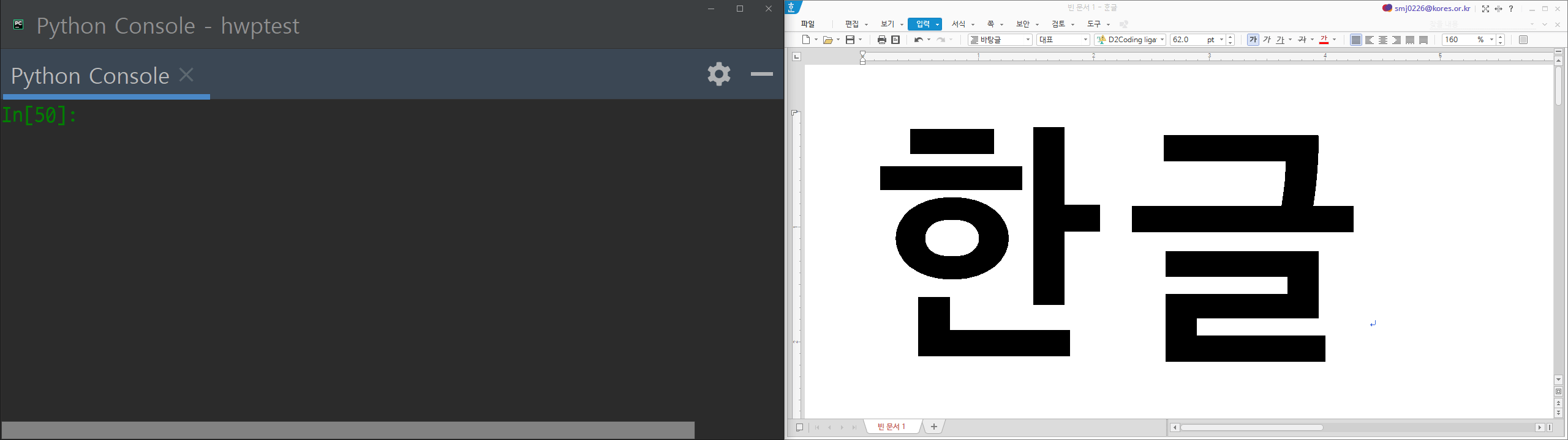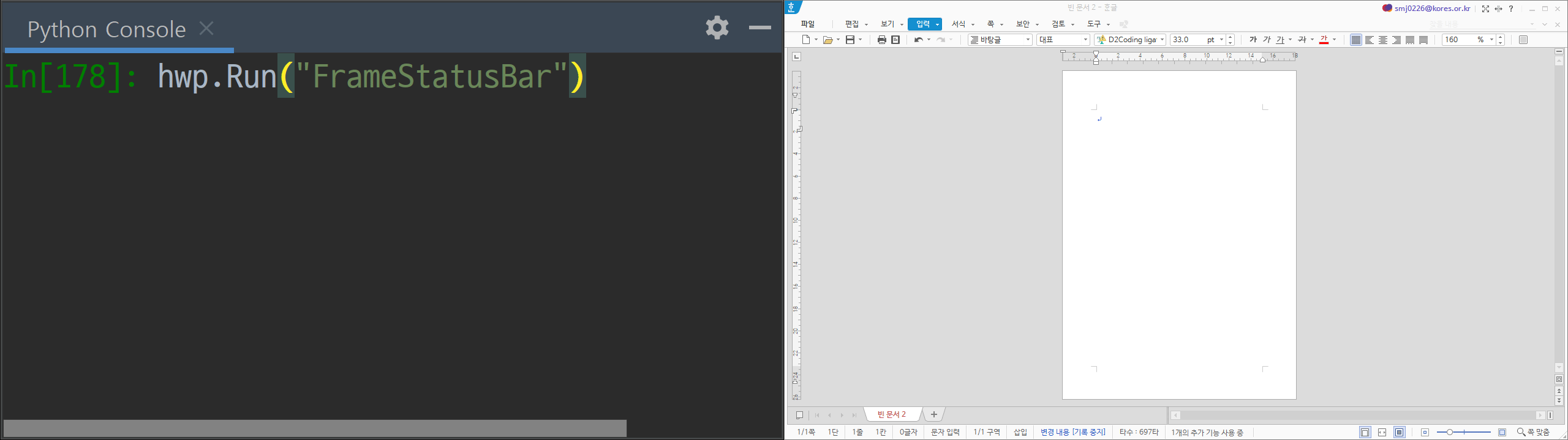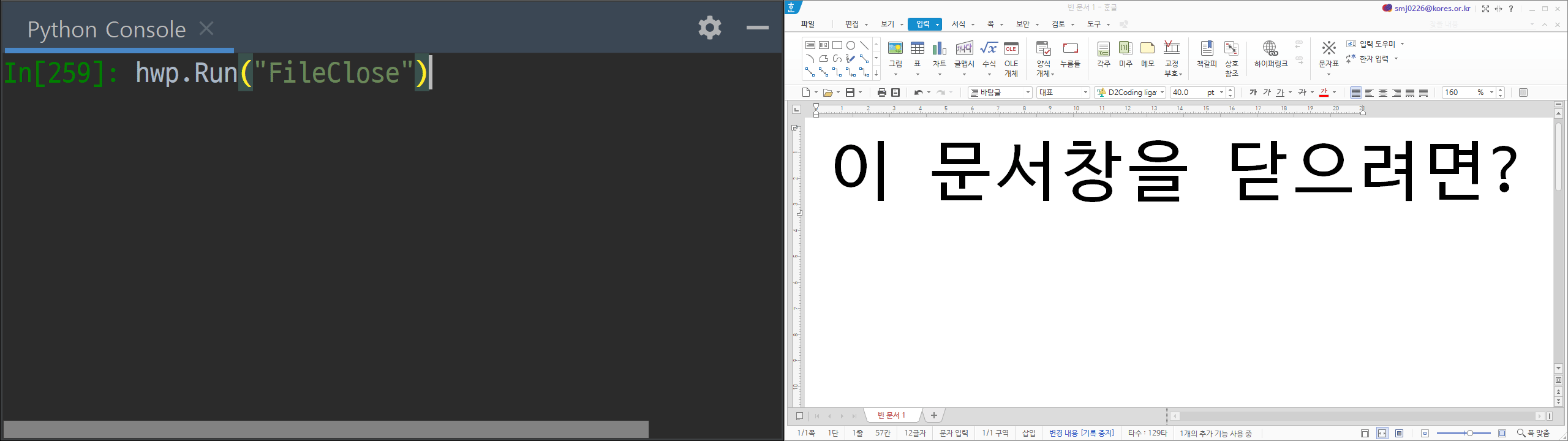 파이썬으로 한/글을 여는 방법은, 파이썬을 열고 아래 코드를 실행하시면 됩니다.