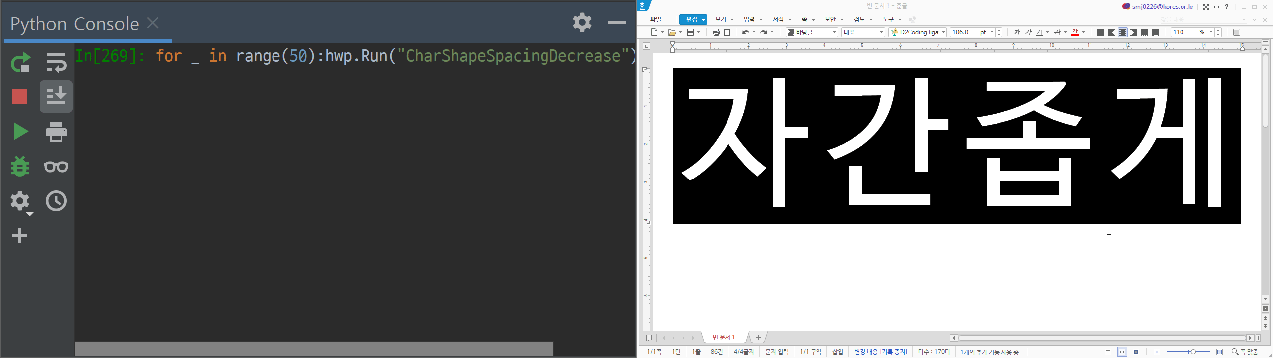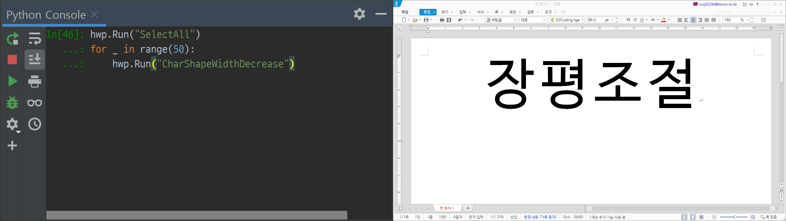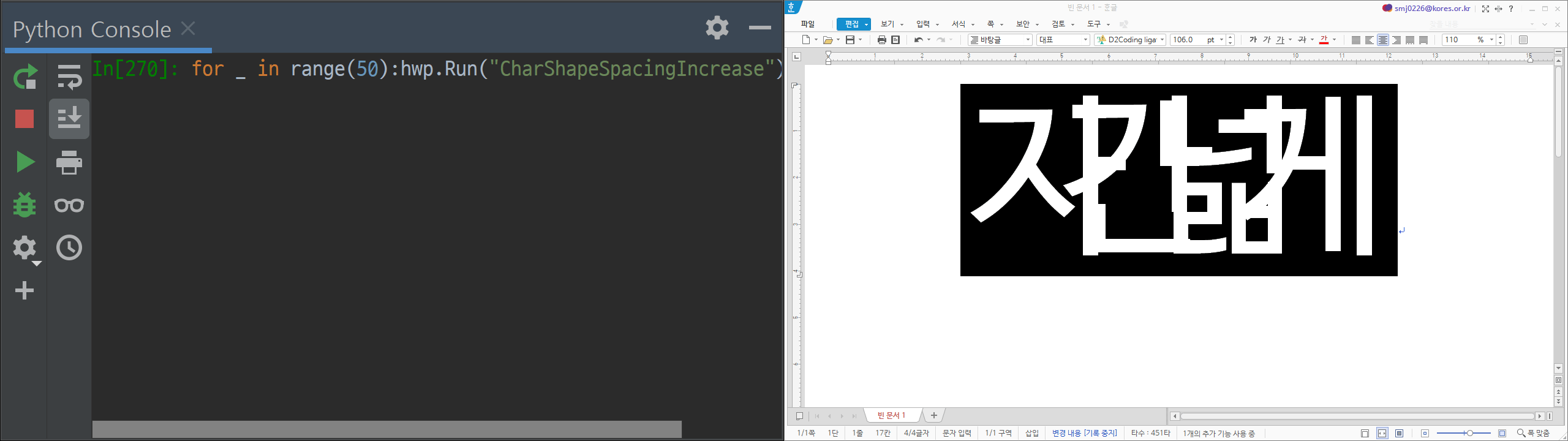 hwp.Run("CharShapeSpacingDecrease") v [Increase] ★☆☆