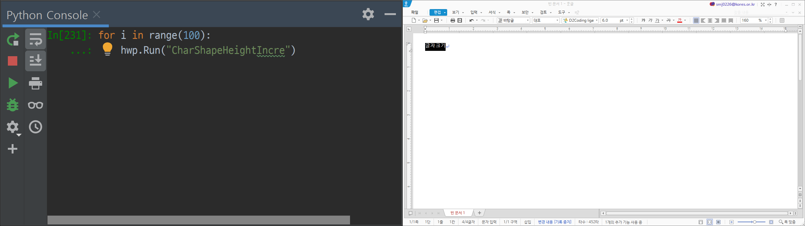 hwp.Run("CharShapeHeightIncrease") ★☆☆