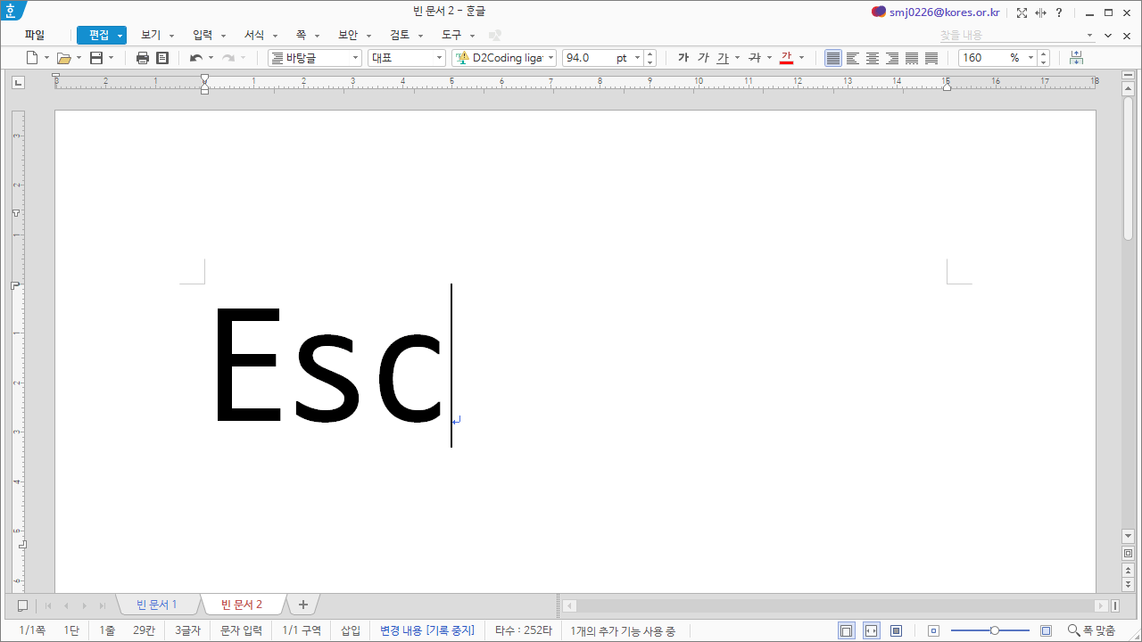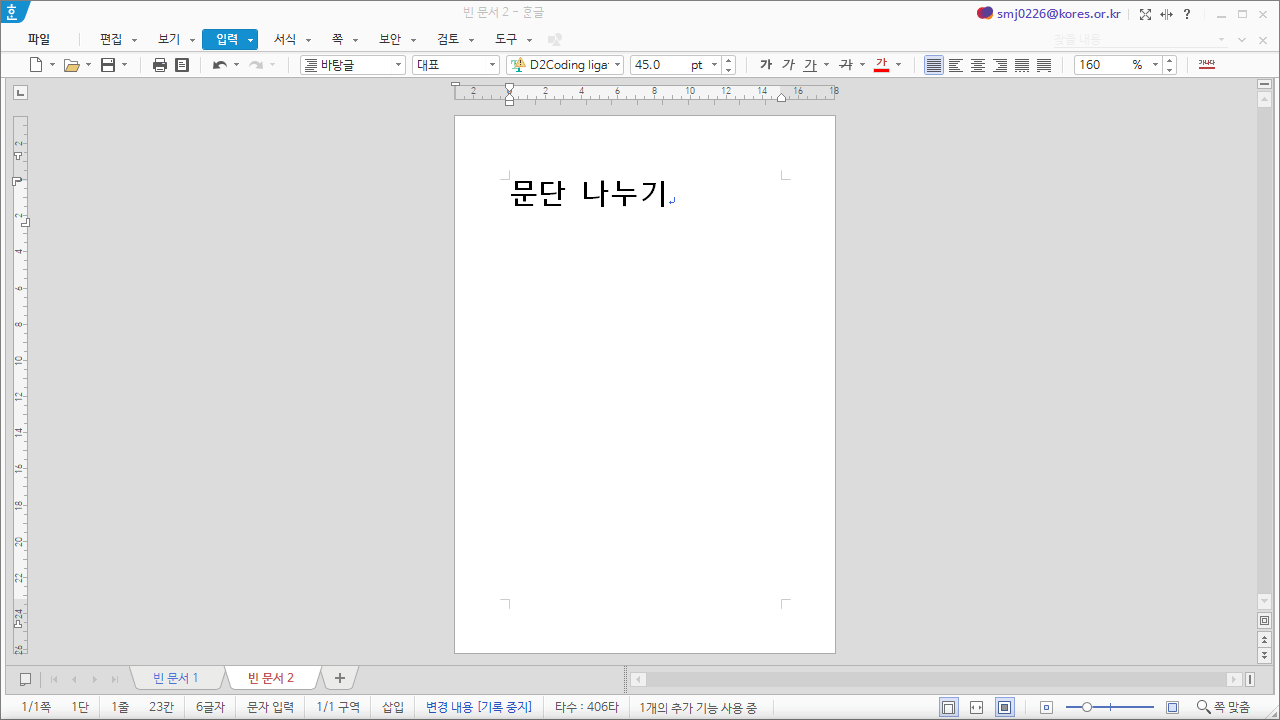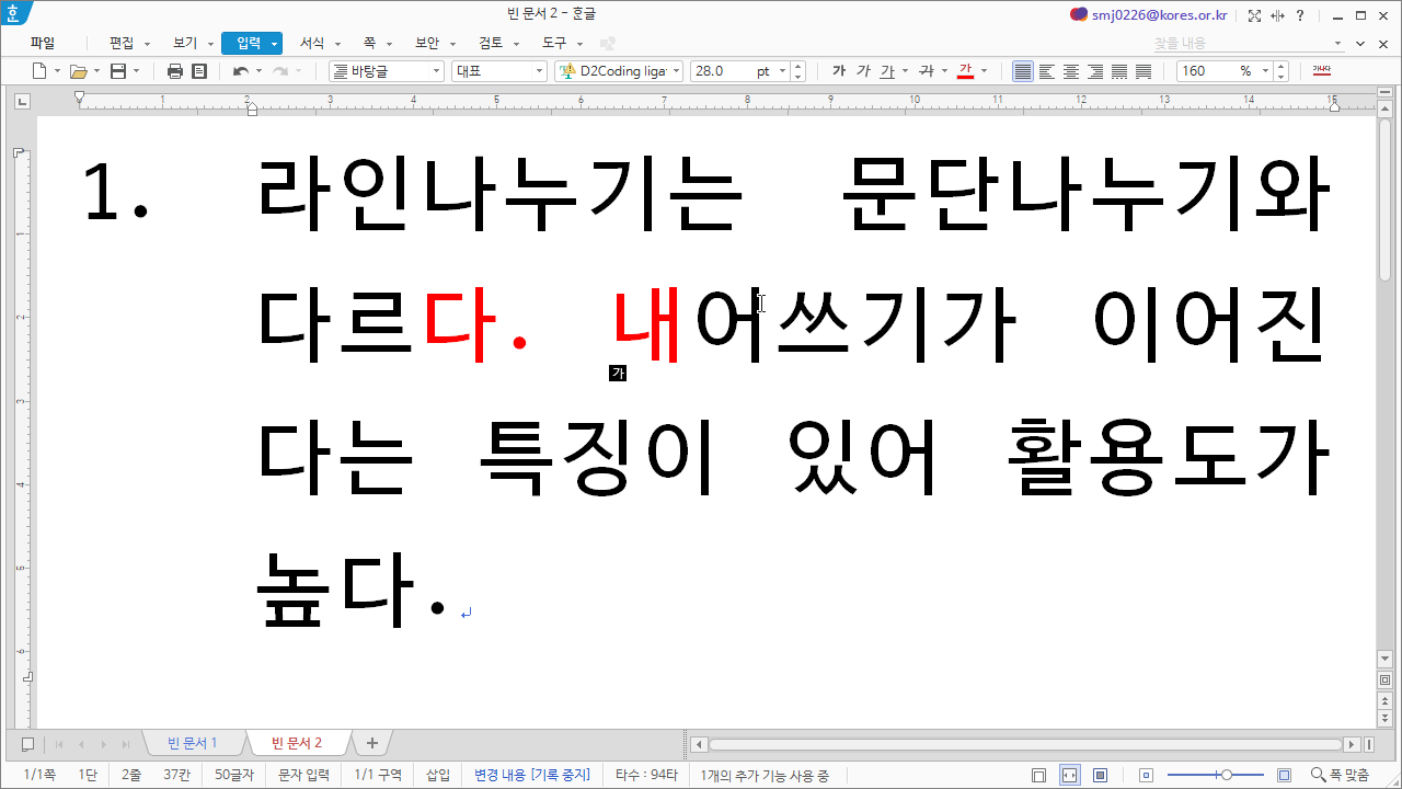한 줄로 입력을 활성화해놓은 문단이나 셀에서는 자간이 아래와 같이 자동으로 좁혀진다.