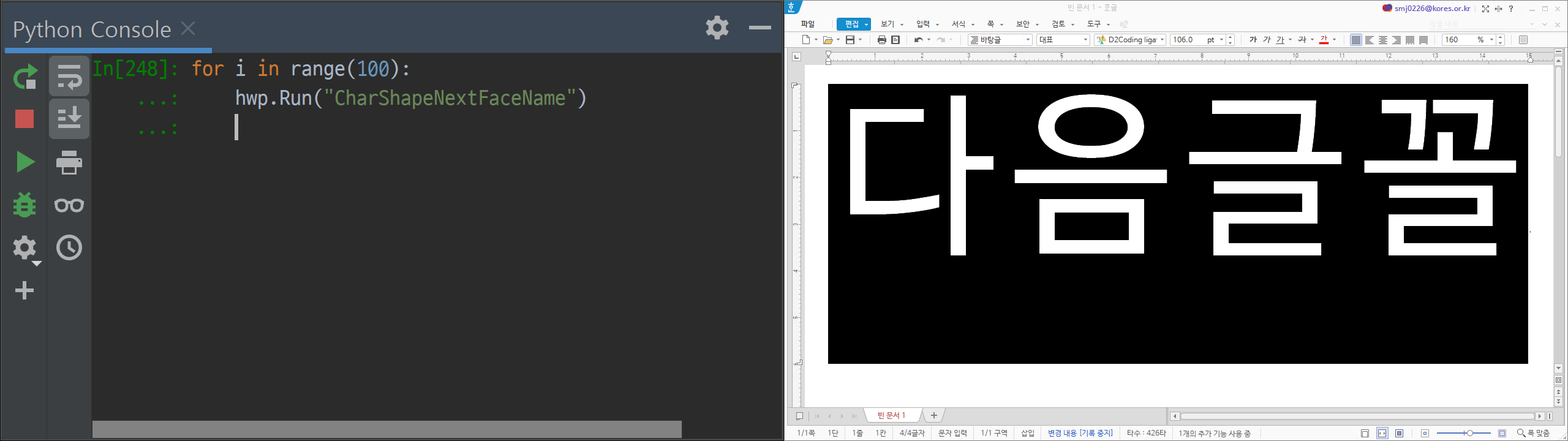 다음 글꼴로 이동(Shift-Alt-F)한다. 단, 이 액션으로 어떤 폰트가 선택되었는지를 파이썬에서 확인하려면 파라미터셋에 접근해야 한다. 유사한 커맨드로, CharShapePrevFaceName 이 있다.