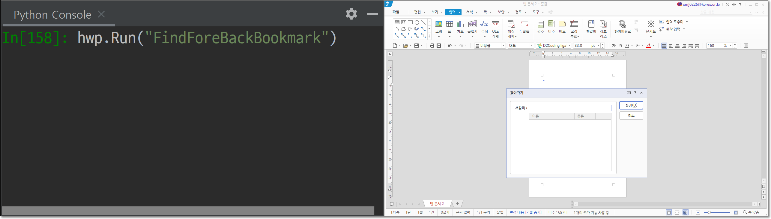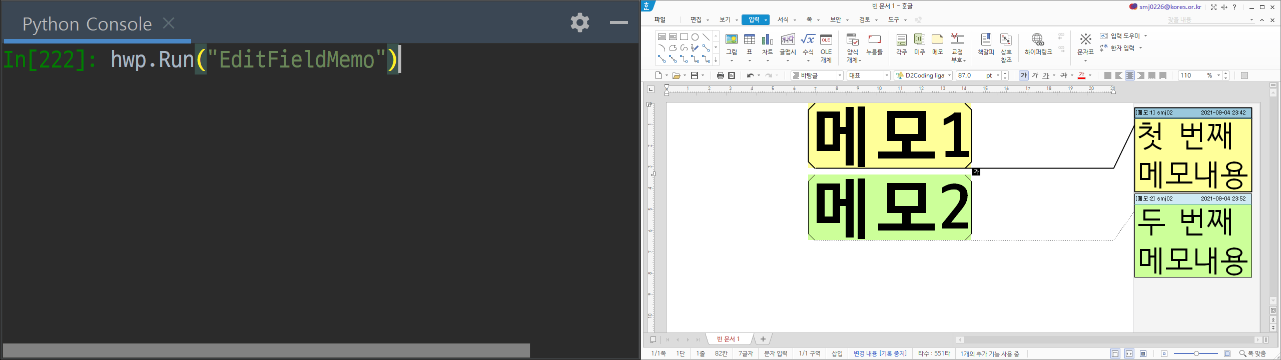 2021. 8. 3. 23:53, 한/글2007 기준 파라미터 필요없는 Run메서드 전부를 우선 추가했습니다. 설명과 시연영상만 틈틈이 추가하면 될 것 같아요. 작성은 파이참 찾아바꾸기로 작업했습니다. (이것도 포스팅으로 남기고 싶네요.) 이것 마친 뒤에는 한/글2020 기준으로 매뉴얼에는 없지만 유용한 새로 생성된 메서드들을 조금 보태려고 합니다.