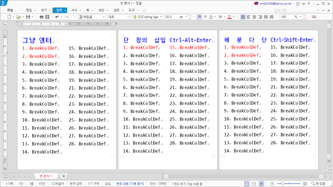 다단 레이아웃을 사용하는 경우 "단 나누기[배분다단] 액션(Ctrl-Shift-Enter)"이다. 아래 이미지의 중간페이지 참조. 단 정의 삽입 위치를 기점으로 구분된 다단을 하나 추가한다. 다단이 아닌 경우에는 일반 "문단나누기(Enter)"와 동일하다.